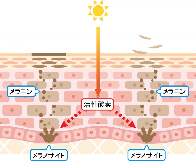夏の日焼けで肌の色が黒くなるのは、この仕組みが原因です。