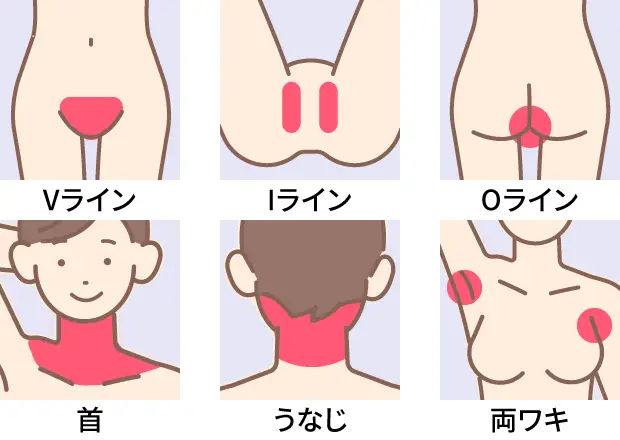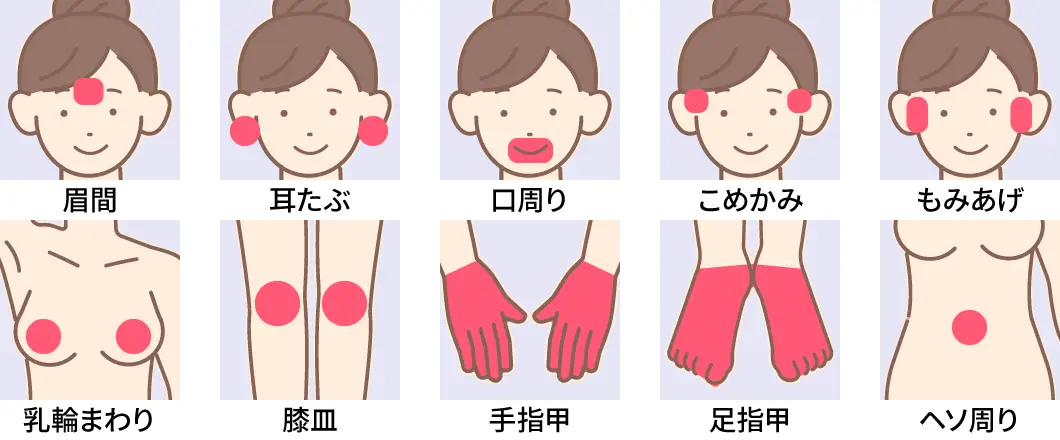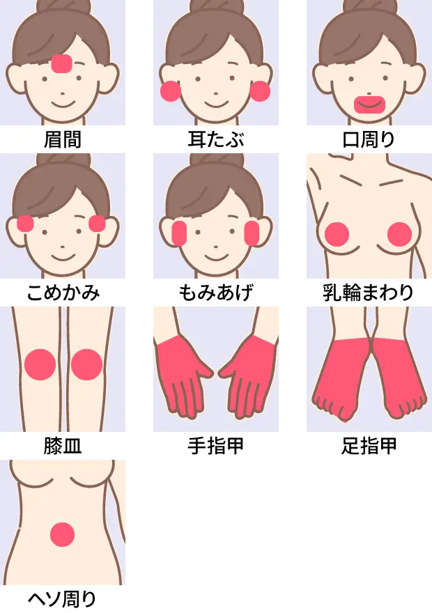 ※Sグループ:眉間・耳たぶ・口周り・こめかみ・もみあげ・乳輪まわり・膝皿・手指甲・足指甲・ヘソ周り