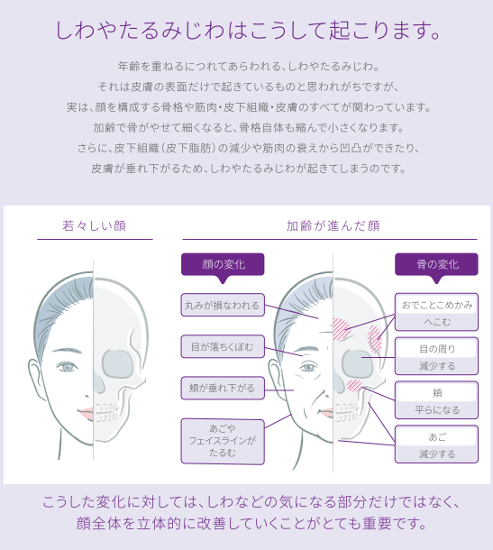 中等度から重度のしわや溝 (鼻唇溝等) を修正するため、真皮中層部から深層部に注入して使用します。
