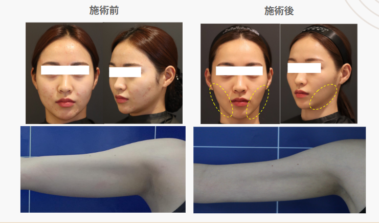 一般的なHIFUは、照射された箇所が約65℃まで温度が上がり、その箇所のタンパク質が熱で変性します。その後に組織が再生することによって肌が引き締まり、リフトアップされます。 リニアハイフは脂肪を減少させる効果があります。リニアハイフはドットより少し低い温度である58℃で照射します。この温度は、人間の脂肪細胞が溶け始める温度に設定されています。その温度の超音波を照射することで脂肪が融解し、排出されます。