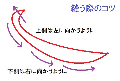 キズの上の縁は極力左側に、キズの下側は極力右側に位置するように縫っていくということです。