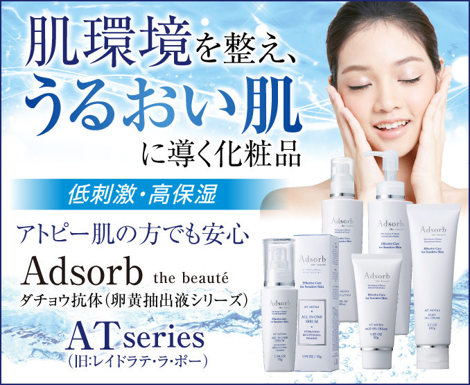 アトピー・ニキビ化粧品シリーズリニューアル!アドソーブ(旧レイドラテ・ラ・ポー) 2018年9月13日 15:54 大好評販売中のダチョウ抗体配合美容液レイドラテ・ラ・ポーシリーズが、アドソーブとしてリニューアルしました! アトピー、ニキビ、花粉の肌荒れでも安心使用! お肌トラブルの原因別の「ダチョウ抗体」配合で、不快な悩みの元を吸着。 だから安全! だから実感! 無料サンプルもご用意しております。