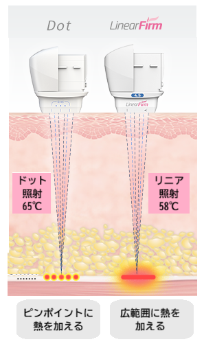 一般的なHIFUは、照射された箇所が約65℃まで温度が上がり、その箇所のタンパク質が熱で変性します。その後に組織が再生することによって肌が引き締まり、リフトアップされます。 リニアハイフは脂肪を減少させる効果があります。リニアハイフはドットより少し低い温度である58℃で照射します。この温度は、人間の脂肪細胞が溶け始める温度に設定されています。その温度の超音波を照射することで脂肪が融解し、排出されます。