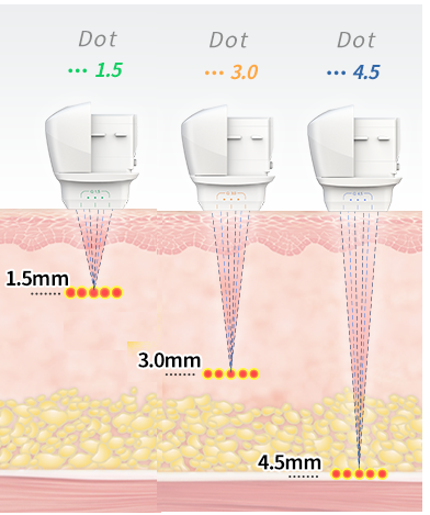 真皮層から皮下脂肪までの深い層に熱を加えることで、皮膚の深い層のタイトニングにより皮膚を引締め、たるみを解消します。